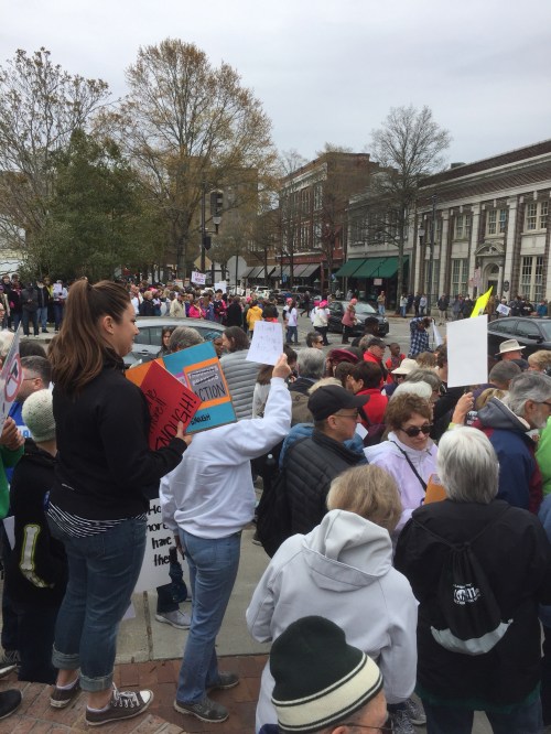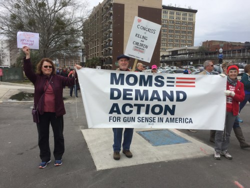 Representing Moms Demand Action for Gun Sense in America, Judy and I along with a couple of dozen other people holding Mom Demand Action signs participated in the March for Our Lives sponsored by high school students in the community. Many thanks to Bonnie MacGlaudlin who helped hold the Moms Demand Action banner throughout the March and speeches. The turnout exceeded the expectations and estimates put the crowd at over 2000. The students gave rousing speeches with enormous cheers from the crowd. They are motivated because they feel their lives are at stake. And they are mad!! They clearly stated that common sense gun violence prevention legislation needs to be passed and they blame elected officials like Tom Tillis, Richard Burr and David Rouzer who were mentioned by name. Specific amounts of money given to each of these elected officials by the NRA were specified. The students could not understand why guns are held in higher regard than their lives. Some very eloquent and impassioned comments were made indicating that the students regard arguments from the NRA about the second amendment as pure BS. The students believe their right to live far outweighs any such thoughts. Specific recommendations included raising the age limit to 21 to purchase a gun, universal background checks for all firearm purchases, ban assault weapons such as AR15 used in many of the school massacres and limit magazines to no more than 8 rounds. These are common sense suggestions and Congress needs to act on them to avoid further school tragedies. Will this eliminate all of them? Of course not. But it would certainly reduce them significantly. If we can make an improvement, why would we not. Let your voice be heard!! The lives of our school children are at stake. Vote out any elected official that will not support the common sense recommendations of these students.